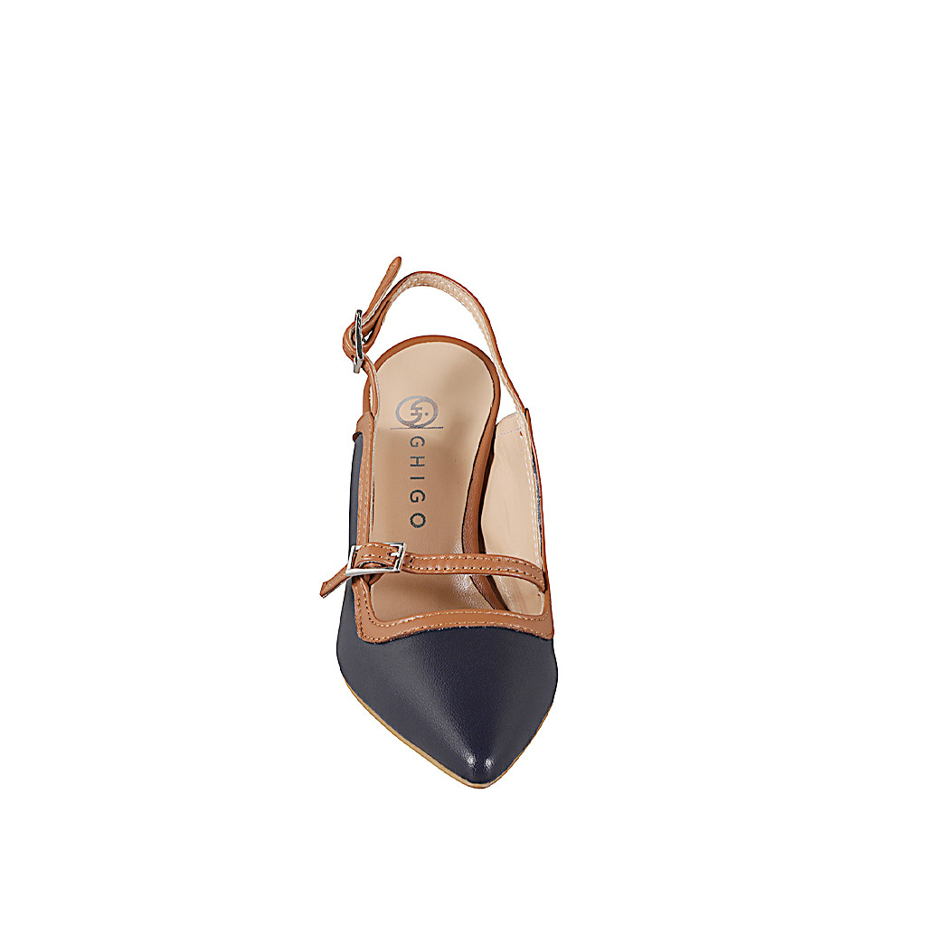 Spitze Damenslingback Mary Jane aus dunkelblauem Leder mit Rand aus cognacbraun Leder, Absatz 7