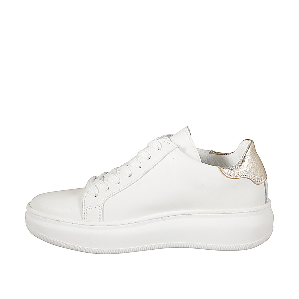 Damenschnürschuh mit abnehmbarer Innensohle und Reißverschluss aus weißem und laminiertem platinfarbenem Leder Keilabsatz 4