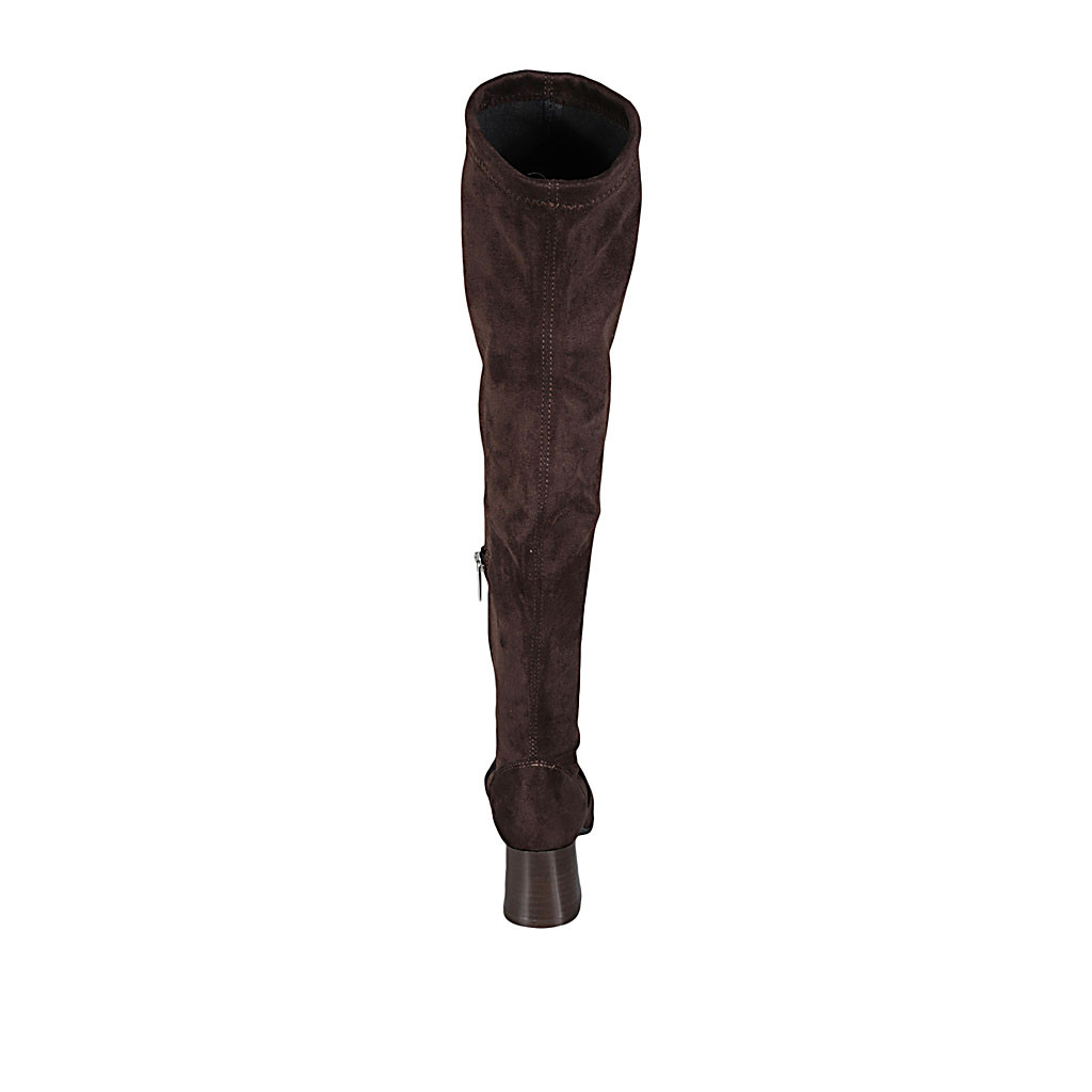 Schenkelhoher Damenstiefel aus braunem elastischem Material und Wildleder mit halbem Reißverschluss Absatz 6