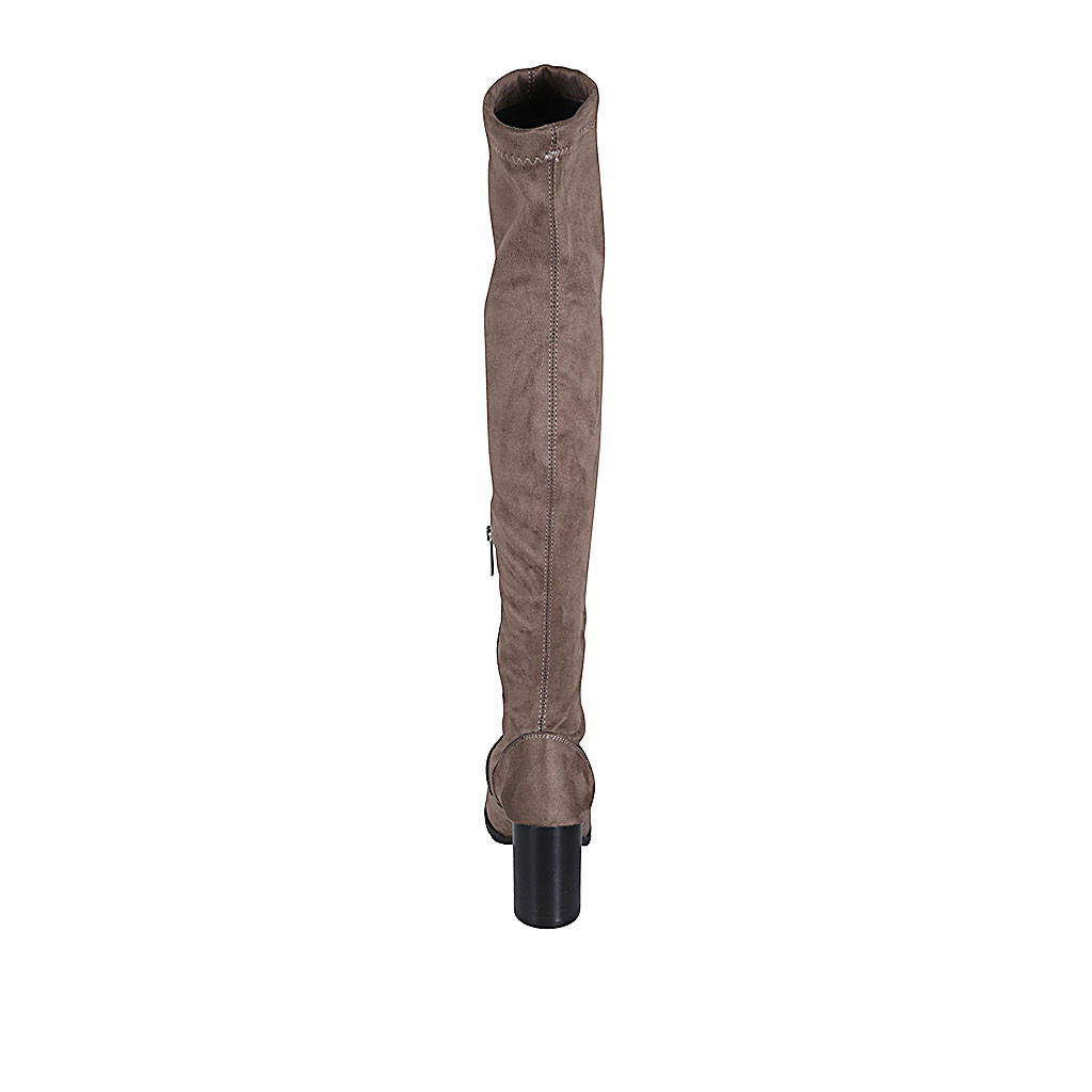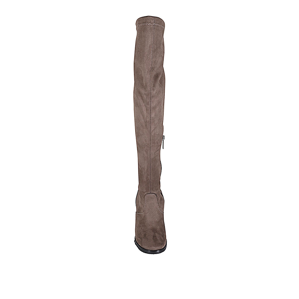 Schenkelhoher Damenstiefel aus taupefarbenem elastischem Material und Wildleder mit halbem Reißverschluss Absatz 7