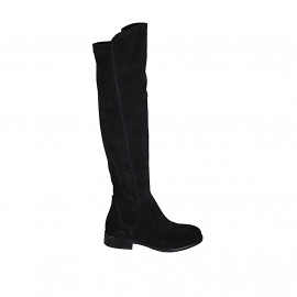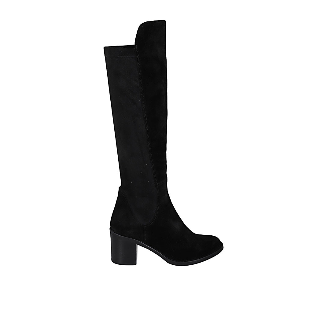 Kniehoher Damenstiefel mit runder Spitze und halbem Reißverschluss aus schwarzem Wildleder und Stretch-Wildleder Absatz 7
