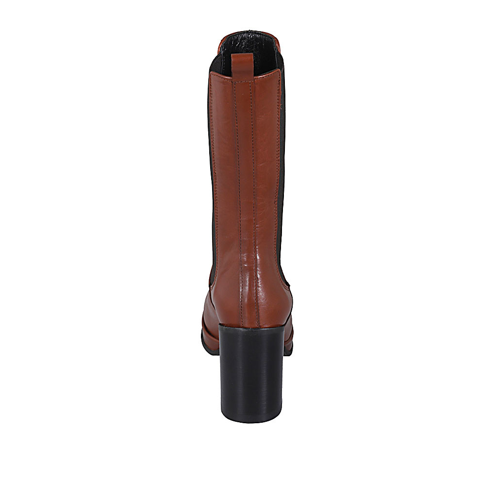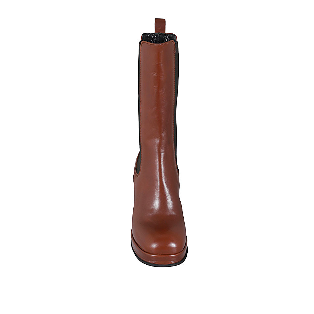 Hohe Damenstiefelette aus cognacbraunem Leder mit Gummibändern und Plateau Absatz 9