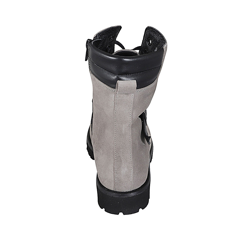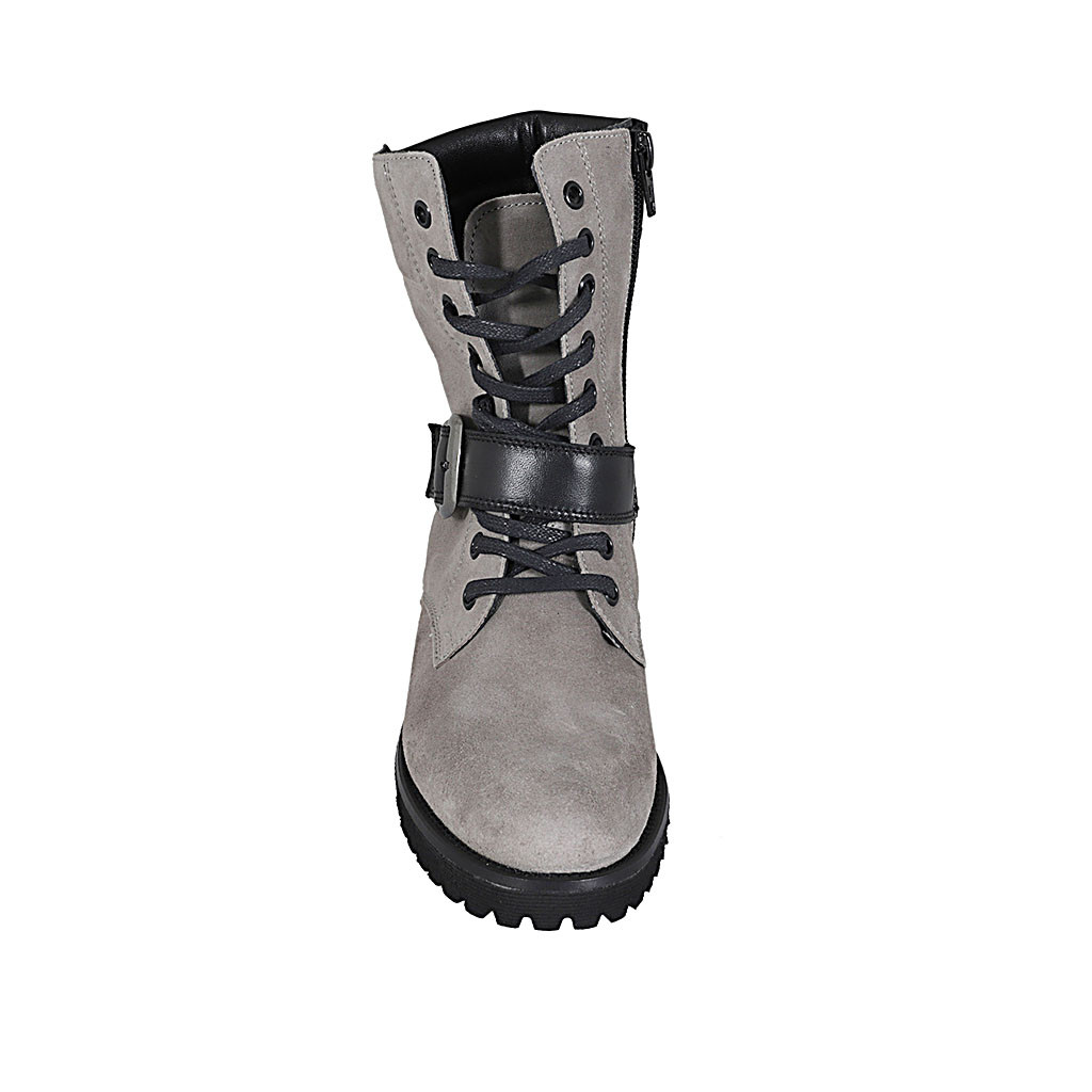 Damenstiefelette mit Schnürsenkeln, Schnalle und Reißverschluss aus grauem Wildleder Absatz 3