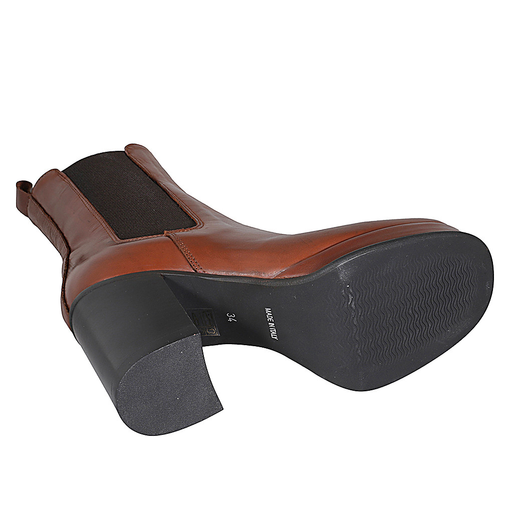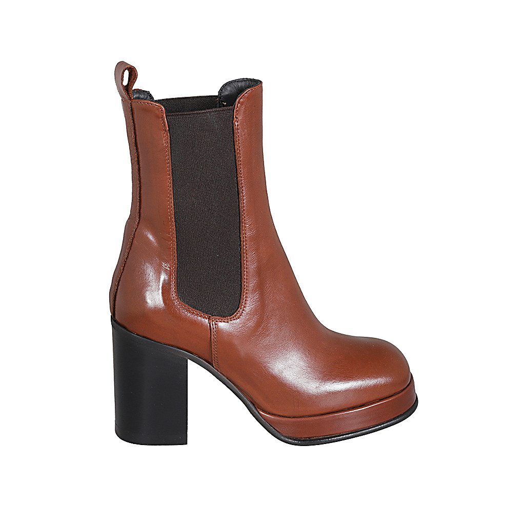 Damenstiefelette aus cognacbraunem Leder mit Gummibändern und Plateau Absatz 8