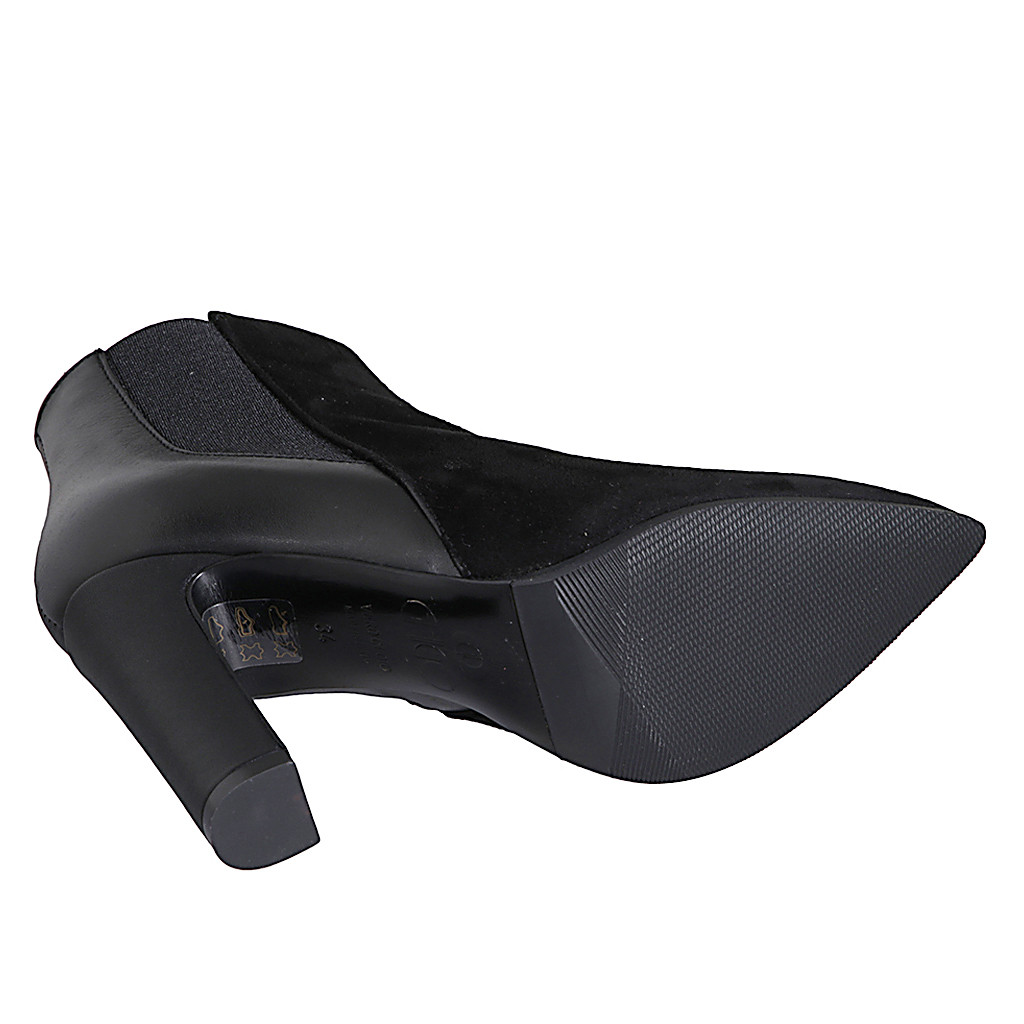 Spitze Damenstiefelette aus schwarzem Leder und Wildleder, mit Gummiband und Reißverschluss Absatz 10