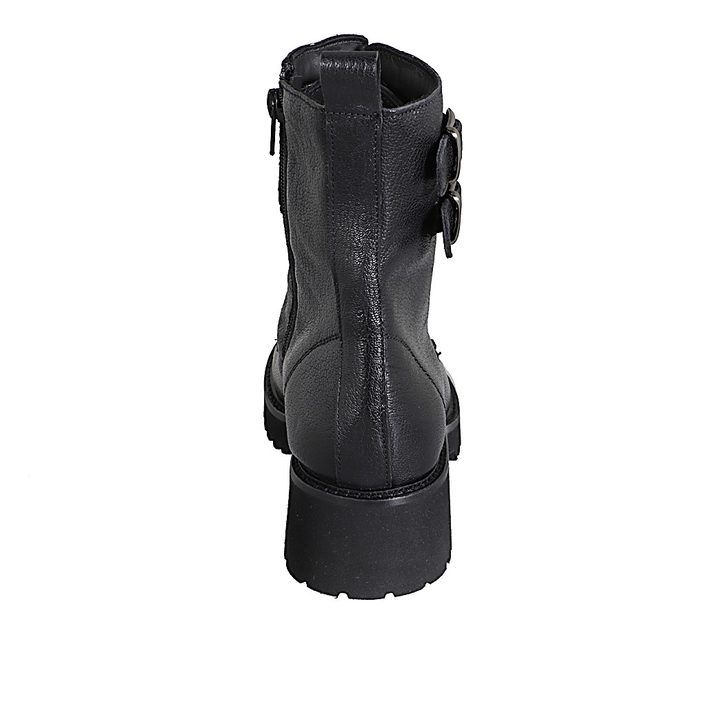 Woman's laced ankle-high boot with double buckles and inner zipper in black leather heel 5