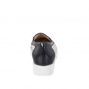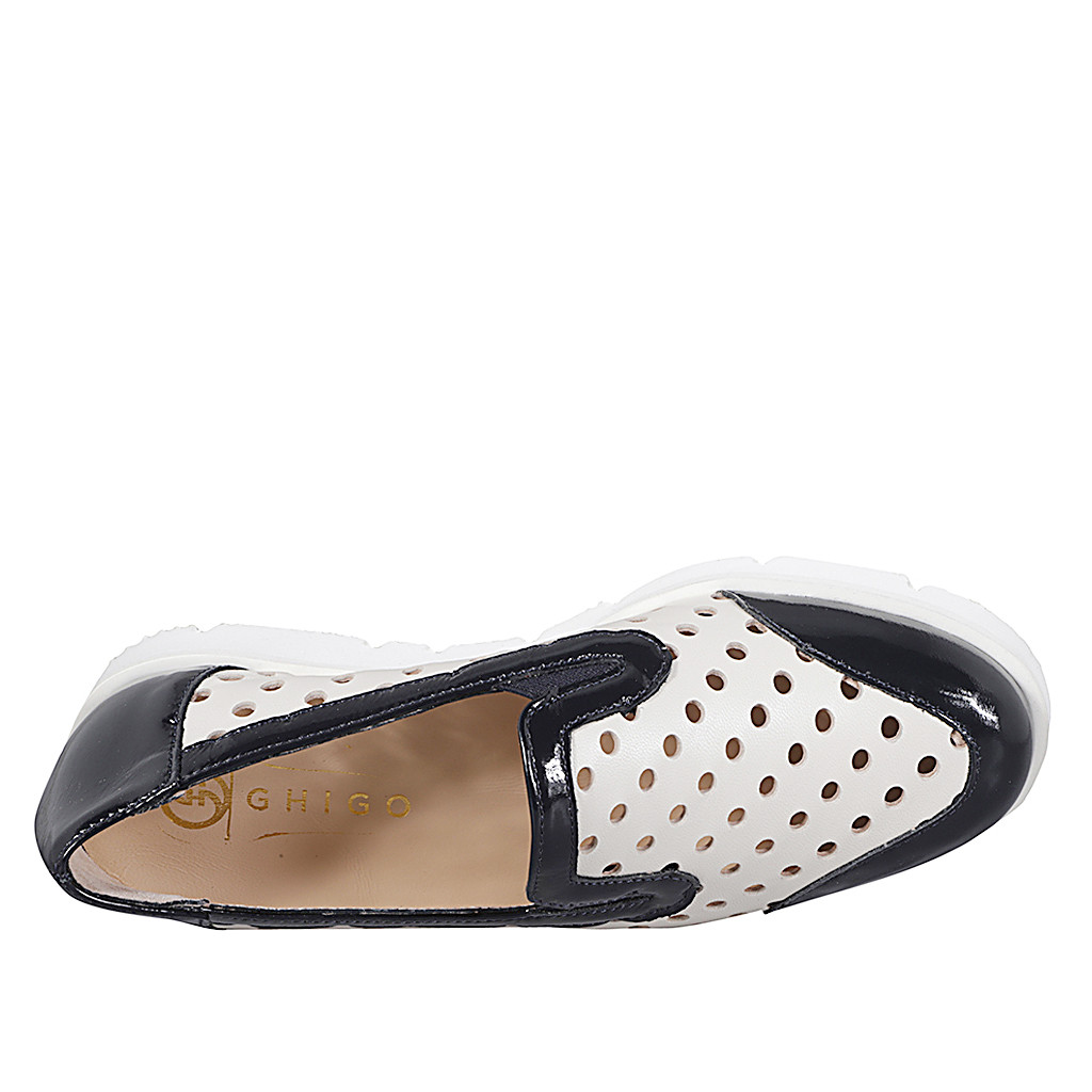 Woman's highfronted shoe with removable insole in ivoiry pierced leather and dark blue patent leather with wedge heel 3