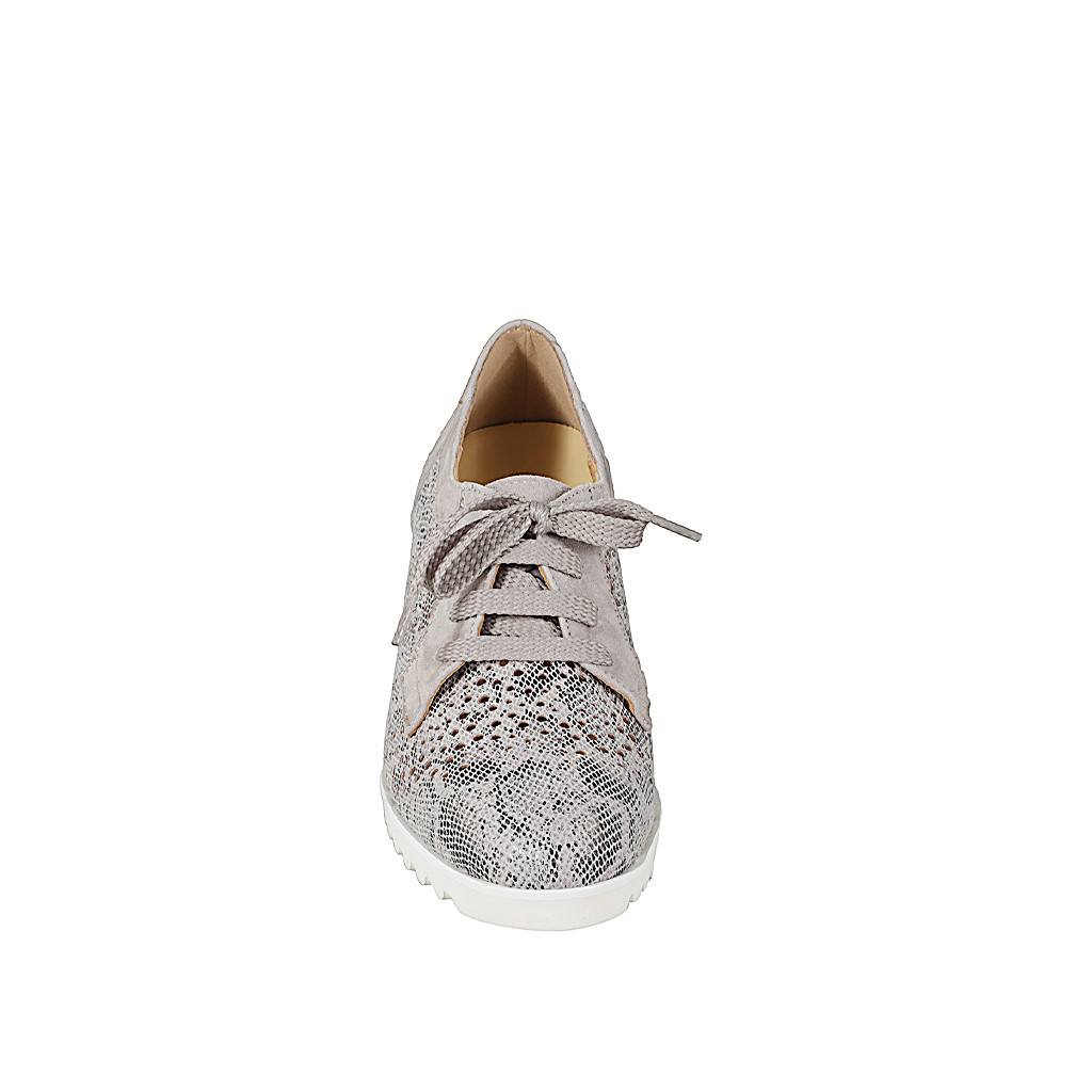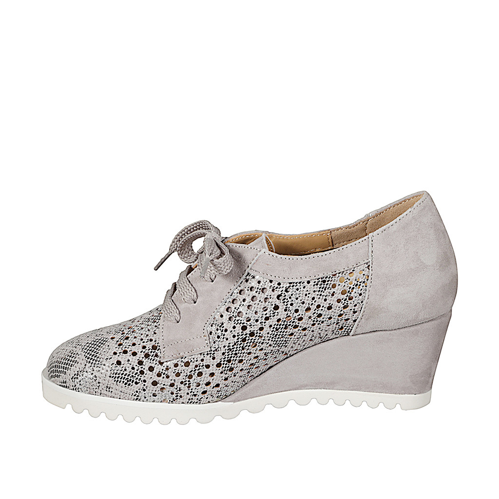 Woman's laced shoe with removable insole in grey suede and printed pierced leather with wedge heel 6