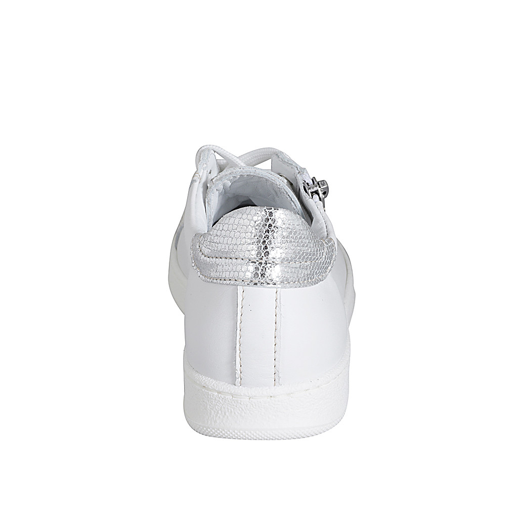 Woman's laced shoe with removable insole and zipper in white and silver laminated leather wedge heel 2