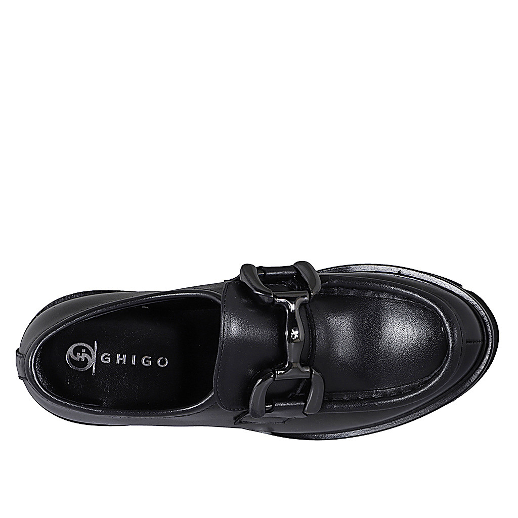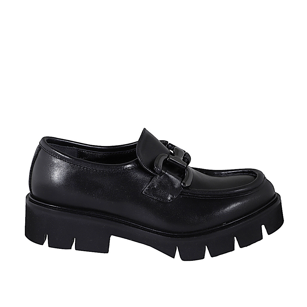 Woman's loafer with elastic and accessory in black leather heel 4 - Available sizes:  32, 33, 35, 42, 45, 46, 47