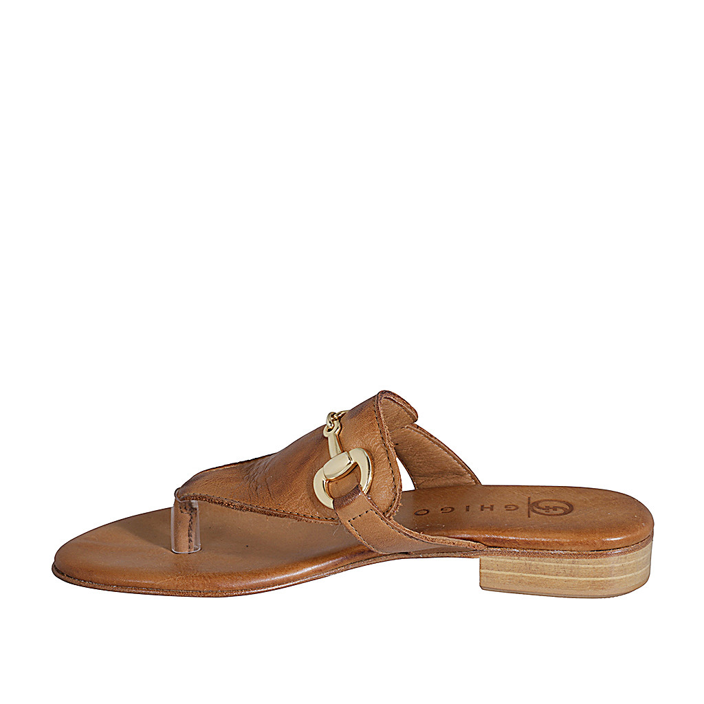 Woman's thong mules with accessory in cognac brown leather heel 2 - Available sizes:  32, 33, 35, 43