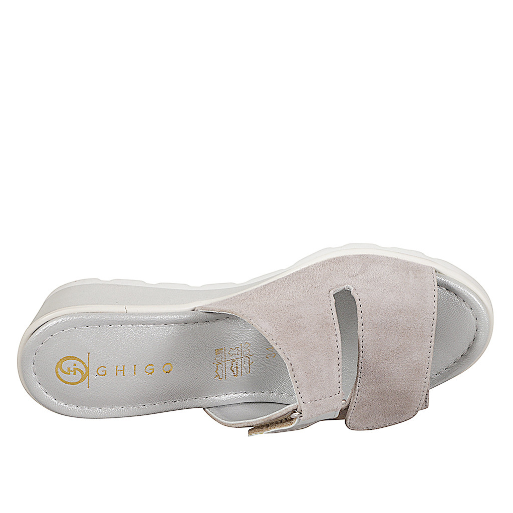 Woman's open mules with memory foam insole, adjustable straps, and flower in red suede with platform and wedge heel 7
