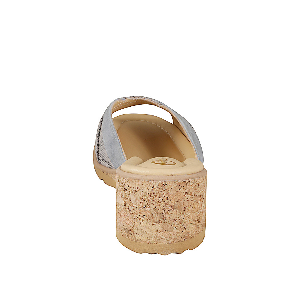 Woman's open mules with memory foam insole in grey and ice suede, cork platform and wedge heel height 7