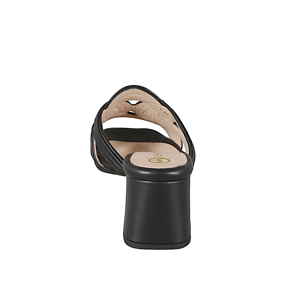 Woman's open mules with crossed straps design in black leather and heel 5