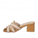 Woman's open mules with crossed straps design in cognac leather and beige suede heel 5