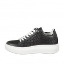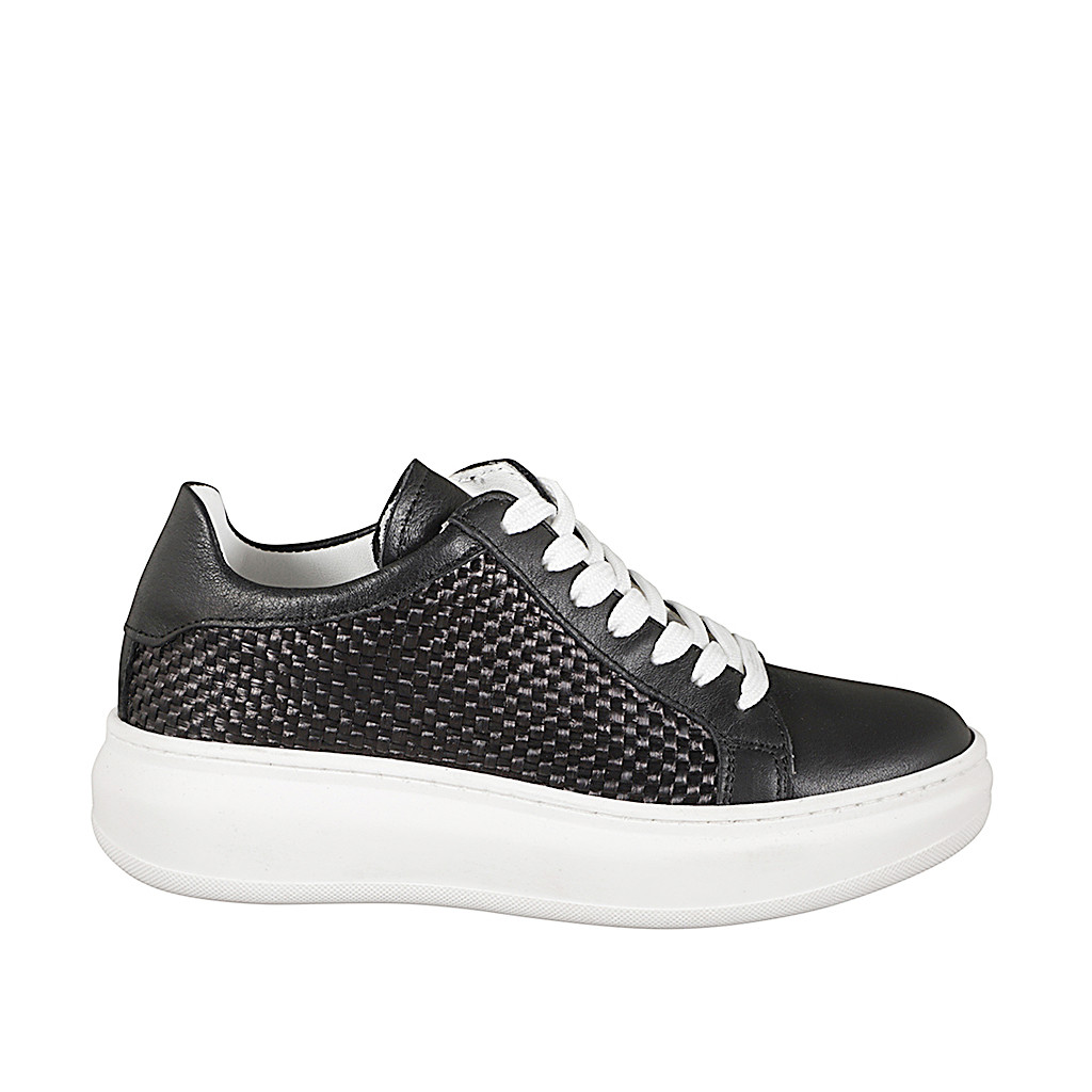 Woman's laced shoe with removable insole in black leather and braided fraffia fabric wedge heel 4