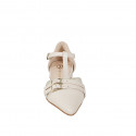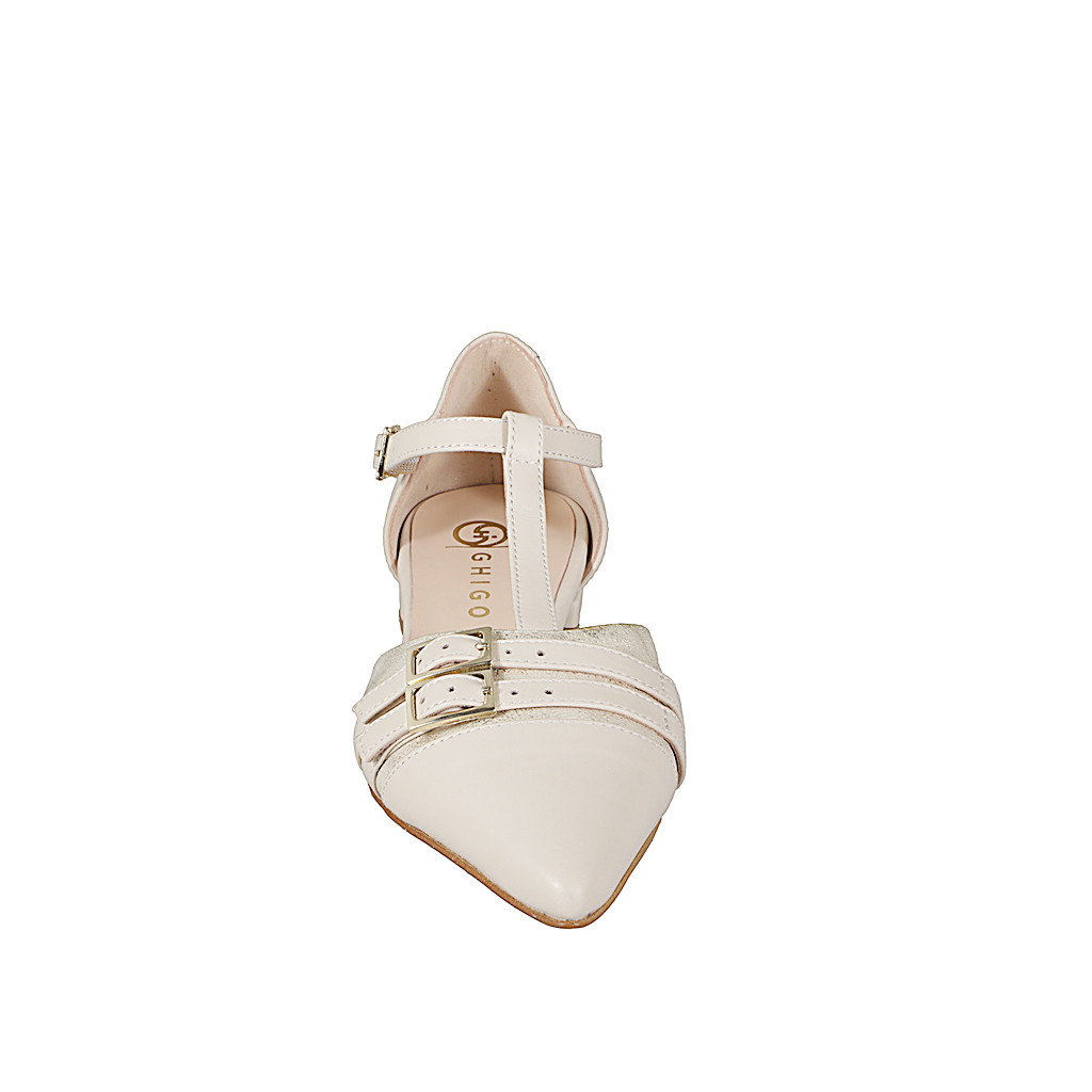 Woman's pump with removable insole and flower decorations in beige pierced suede and platinum...