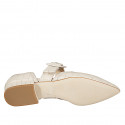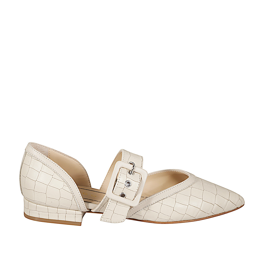 Woman's pointy open shoe with buckle in ivory printed leather with heel 2