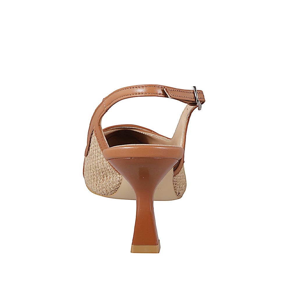 Woman’s slingback in beige drawstring fabric with cognac leather button and edges with heel 7