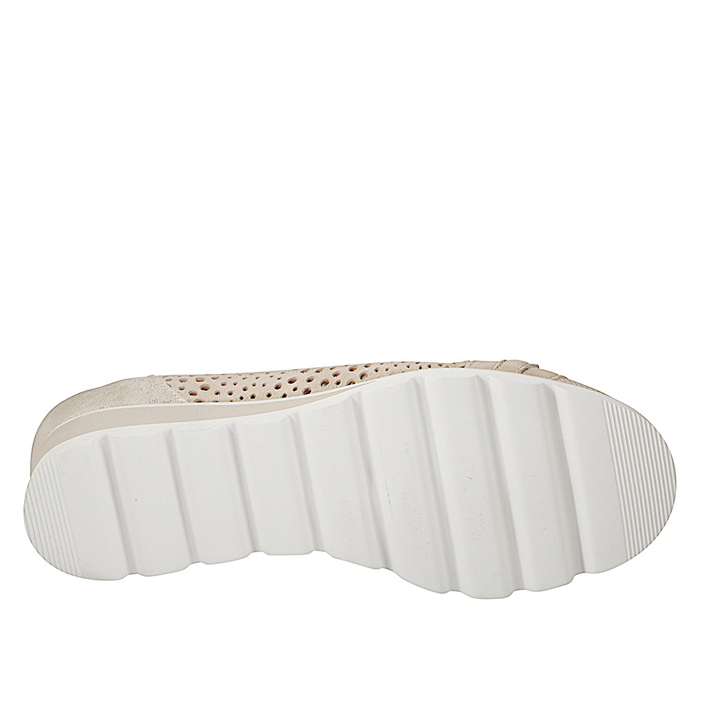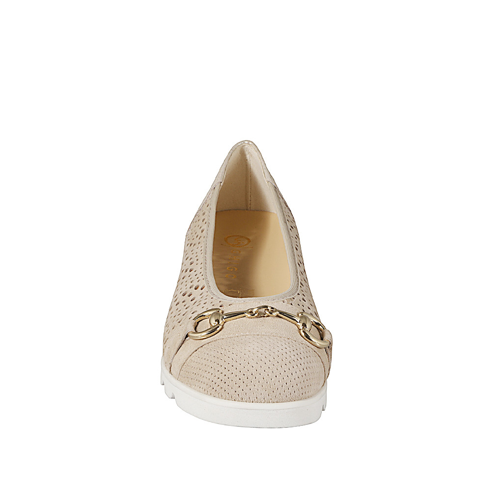 Woman's pump with removable insole and accessory in beige pierced suede and laminated platinum suede with wedge heel 3