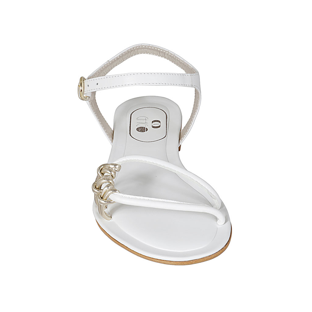 Woman's strap sandal in white leather and platinum laminated leather heel 2