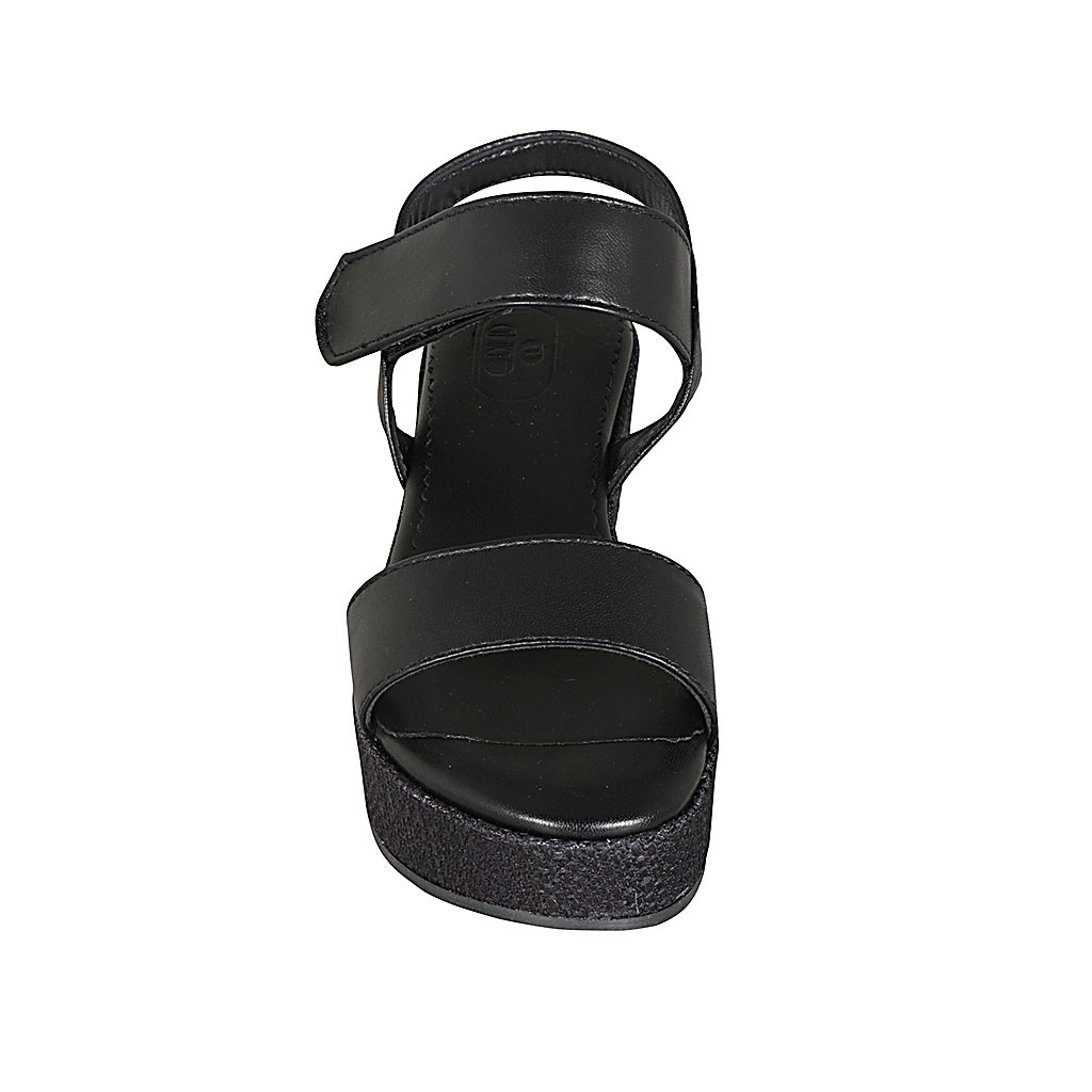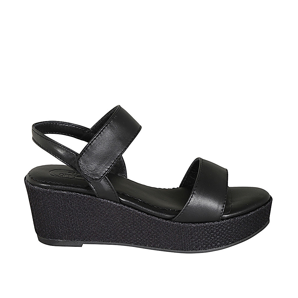 Woman's sandal in black leather with velcro strap wedge heel 6