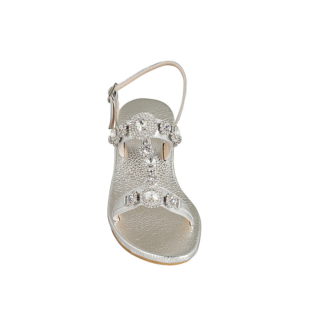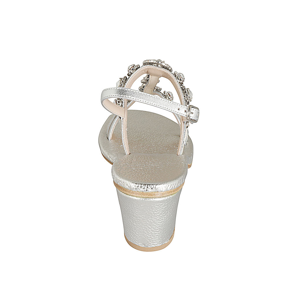 Woman's sandal  with crystal flowers-shaped rhinestones in laminated silver leather heel 6 - Available sizes:  42