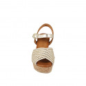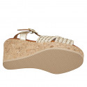 Women's sandal in white leather and white fabric with small inserts in platinum and beads, wedge heel 9