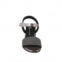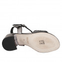 Women's sandal with ankle strap in dark grey laminated leather and grey fabric with silver inserts, heel 6