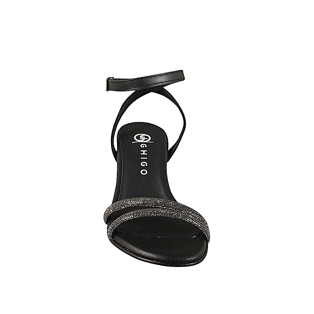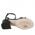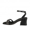 Women's sandal with ankle strap in black leather and straps with steelgrey rhinestones with heel 6