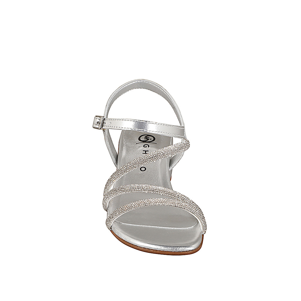 Women's sandal with ankle strap in laminated silver leather and straps with silver rhinestones heel 4