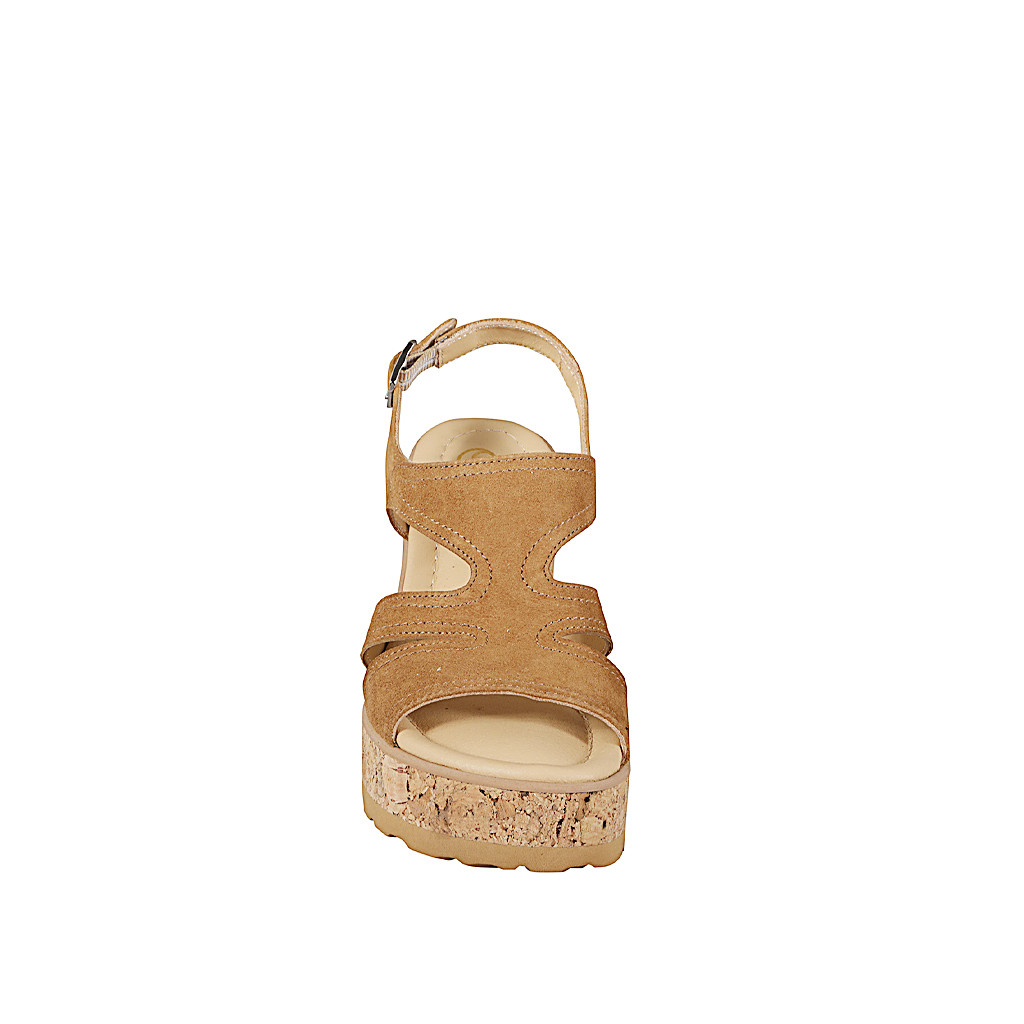 Woman's sandal with insole in memory foam, in cognac suede and with cork platform and wedge heel height 9