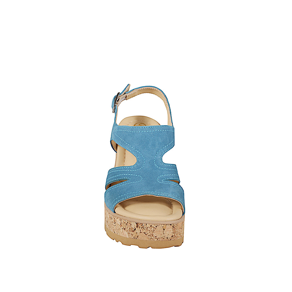 Woman's sandal with insole memory foam in beige, grey and brown suede with plissé effect, cork platform and wedge heel 9