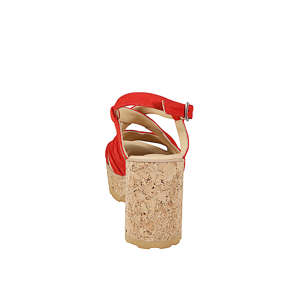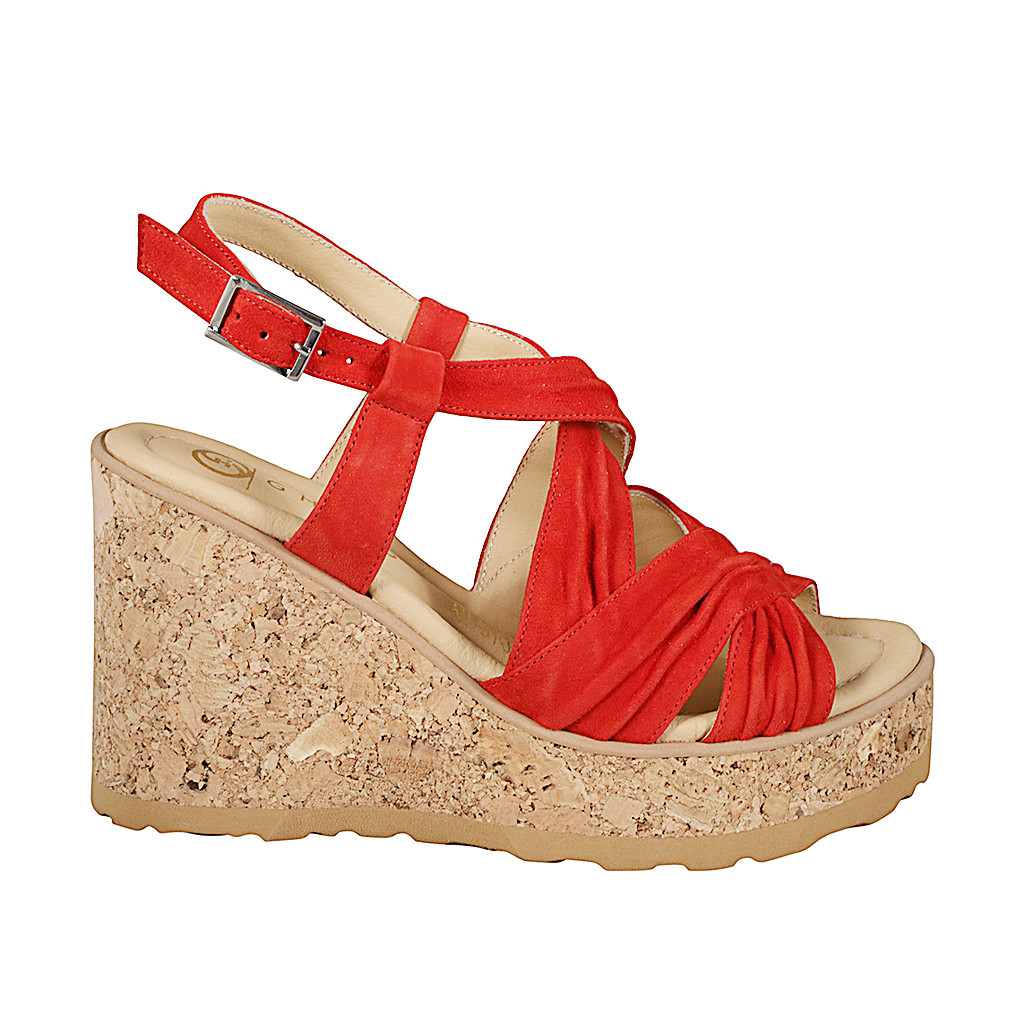 Woman's sandal with insole memory foam in red suede with plissé effect, cork platform and wedge heel 9
