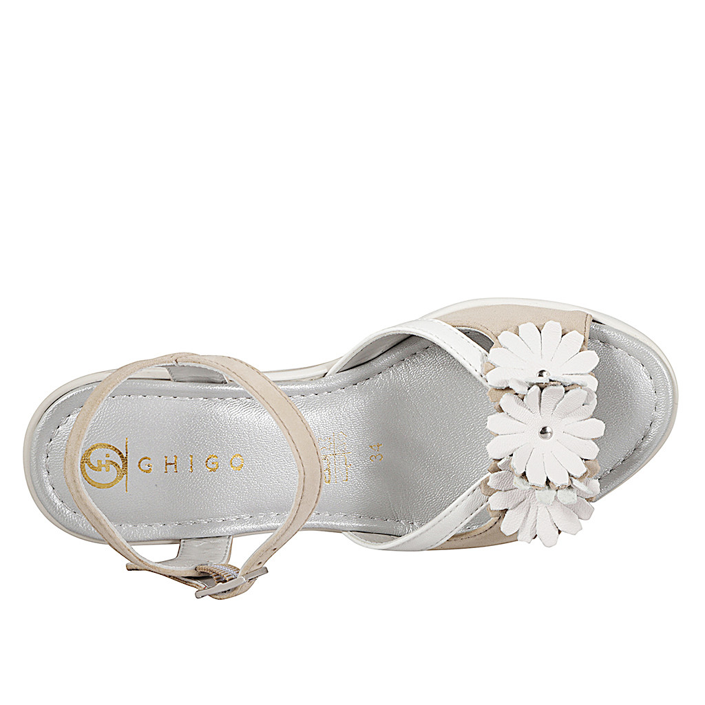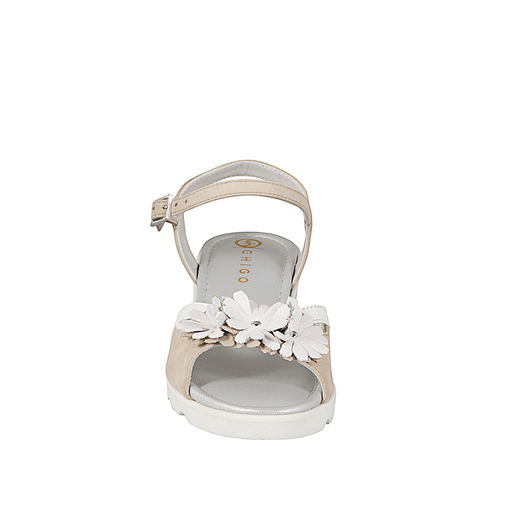 Woman's sandal with insole in memory foam and flower decoration, in beige suede and white leather, wedge heel 5