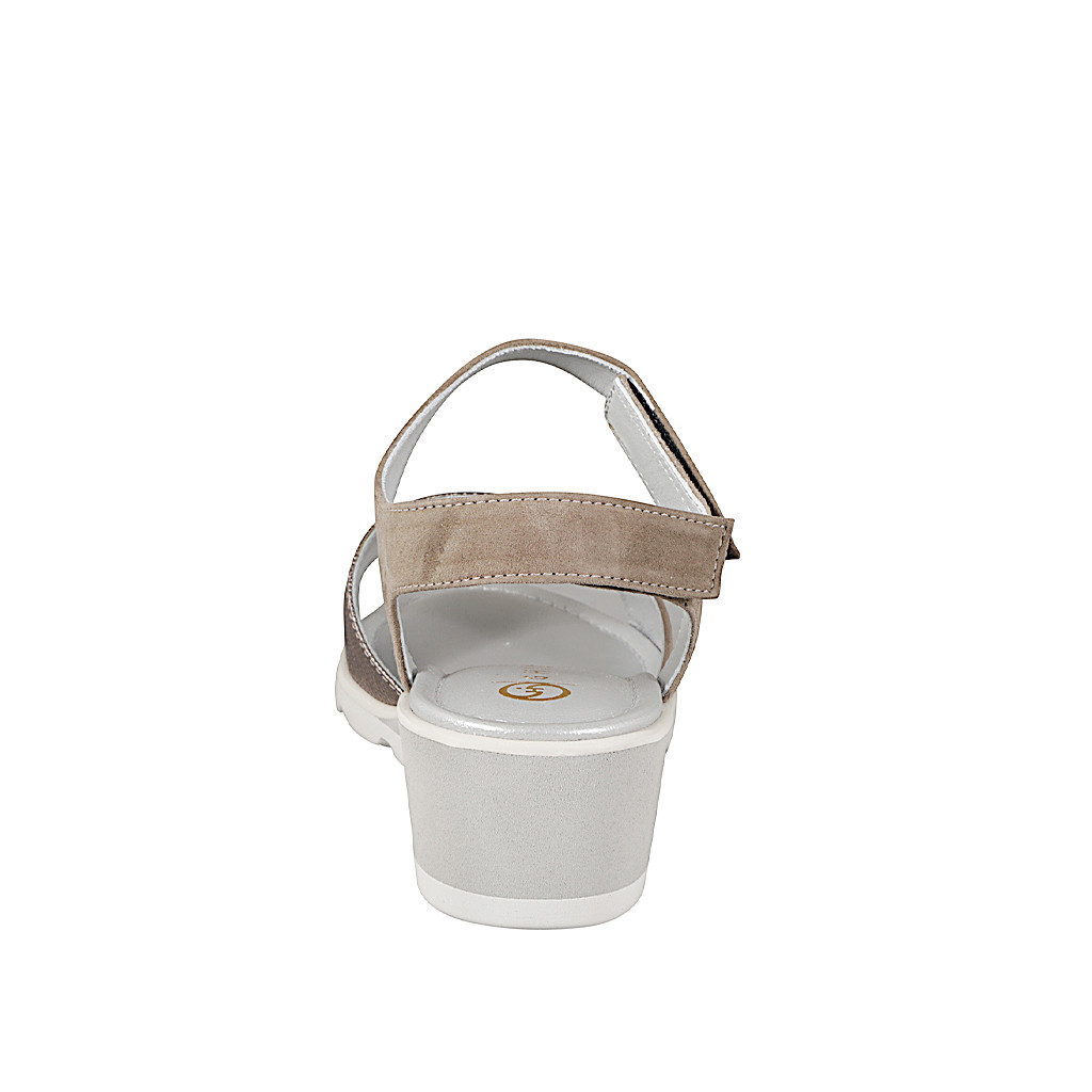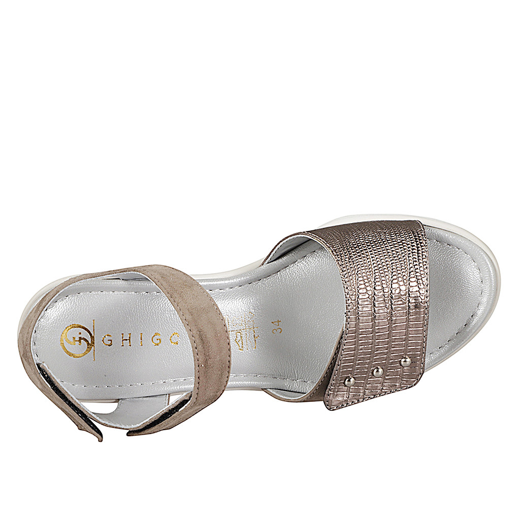 Women's sandal with memory foam footbed and Velcro strap and band, in suede and taupe printed leather with studs, wedge heel 5