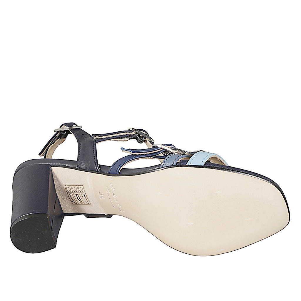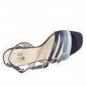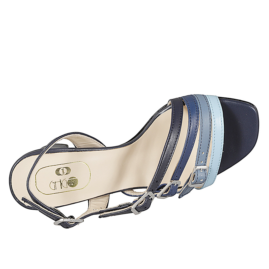 Woman's sandal with 3 crossed straps in dark blue, light blue, grey-blue, and cobalt blue leather with heel 8