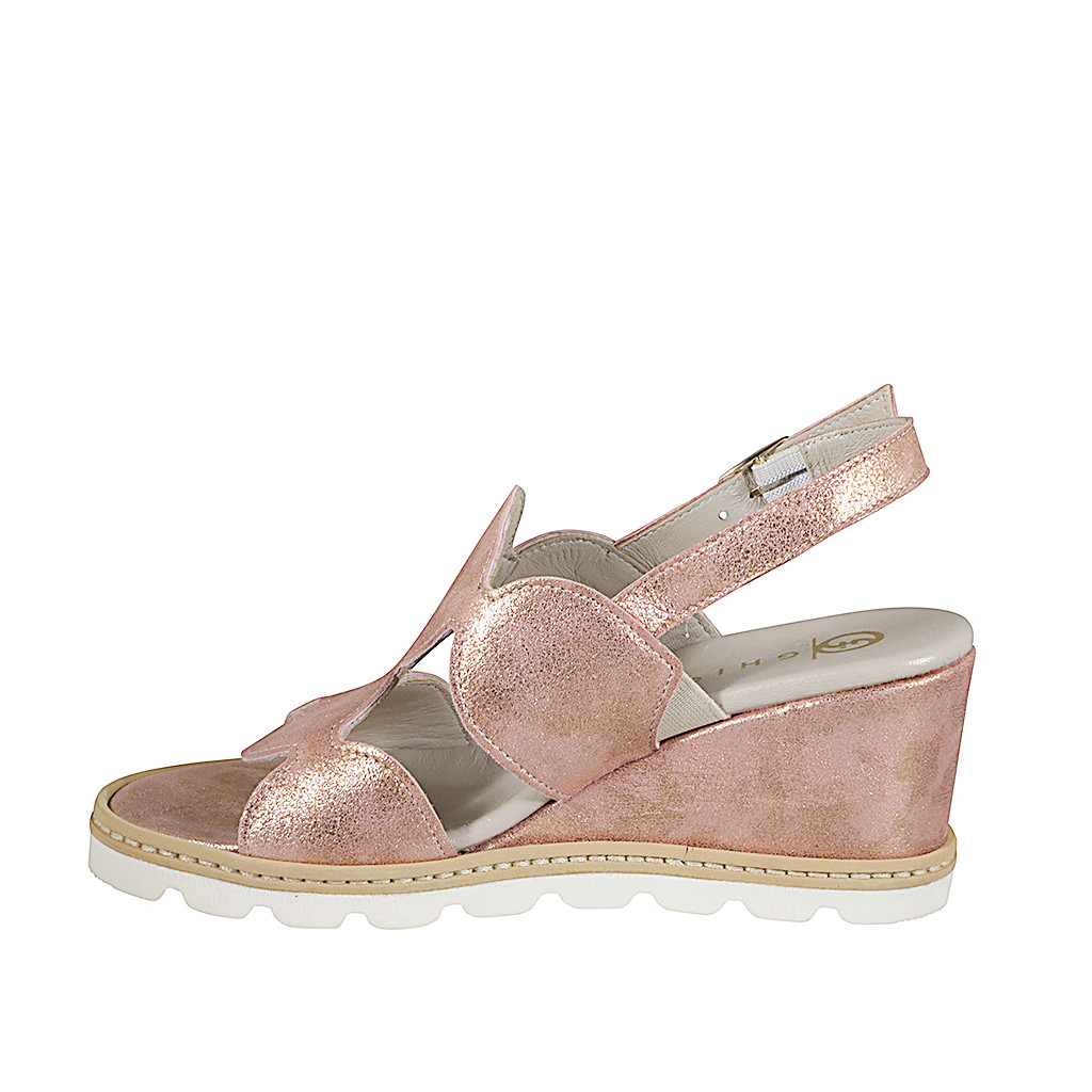 Woman's sandal with leather covered wedge and geometric design in laminated pearky pink leather with wedge heel 5