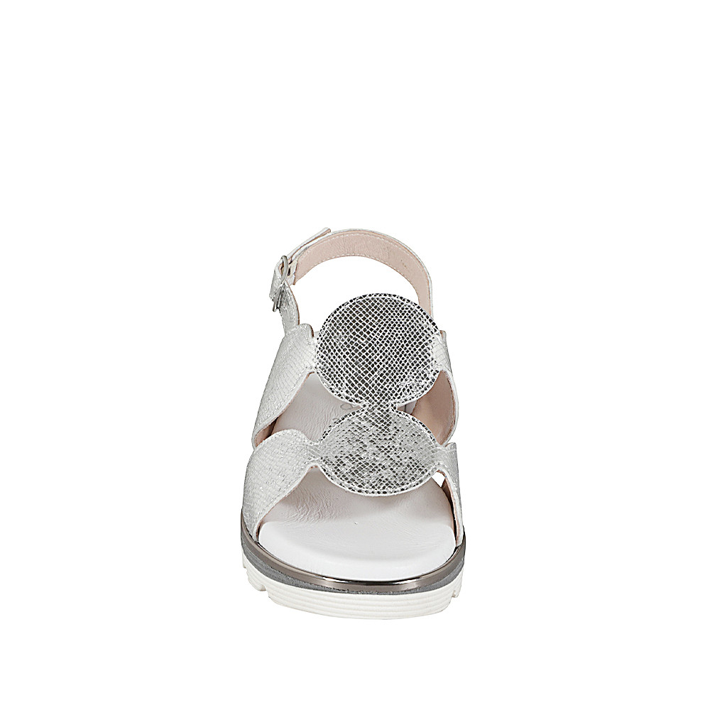 Woman's sandal with 2 bands and buckle in laminated blue leather, wedge heel 4
