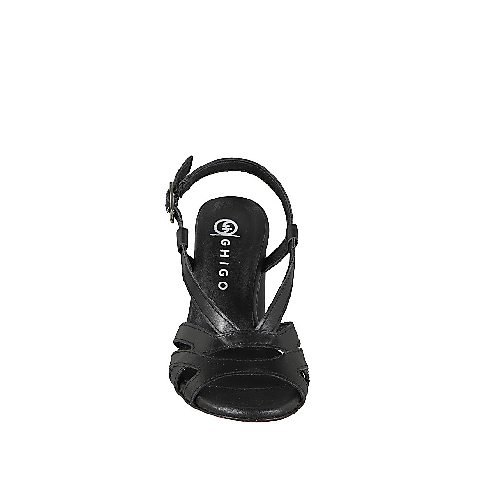 Woman's sandal with straps design in black leather and heel 7
