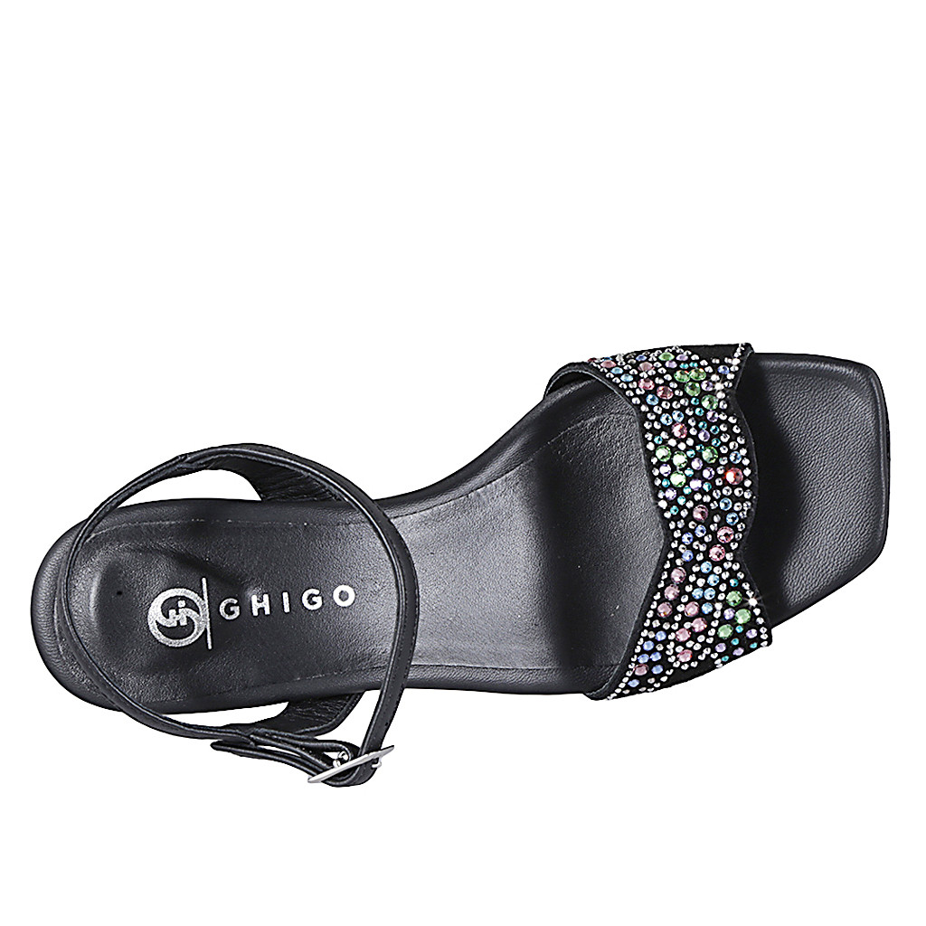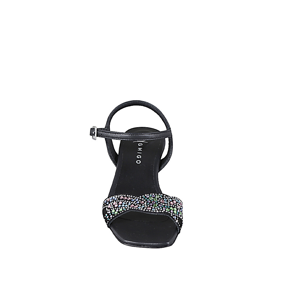 Woman's sandal with black leather ankle strap and black suede with rhinestones, heel 6. Refined and top-quality design!