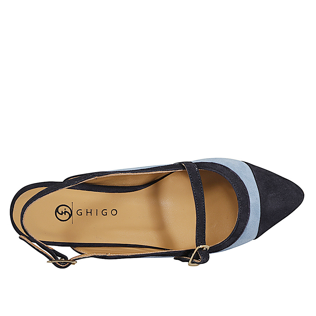 Woman's pointed slingback flat with strap in light blue suede and cap toe and edges in dark blue suede, heel 2