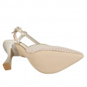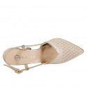 Woman’s pointy slingback in shiny beige fabric and platinum laminated leather heel 9