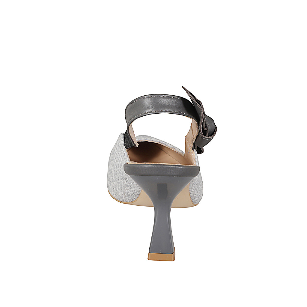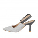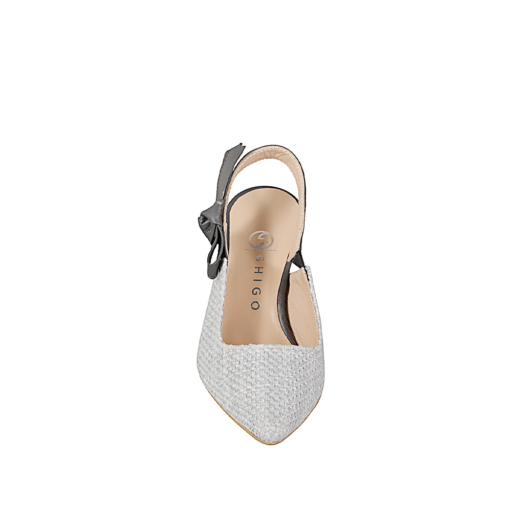 Women's sandal in laminated platinum leather and turquoise fabric with small inserts in platinum...