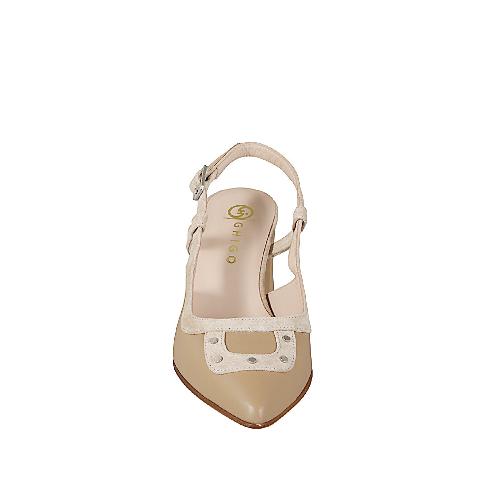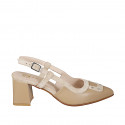 Woman’s pointy slingback with buckles in light beige leather and laminated platinum leather heel 3