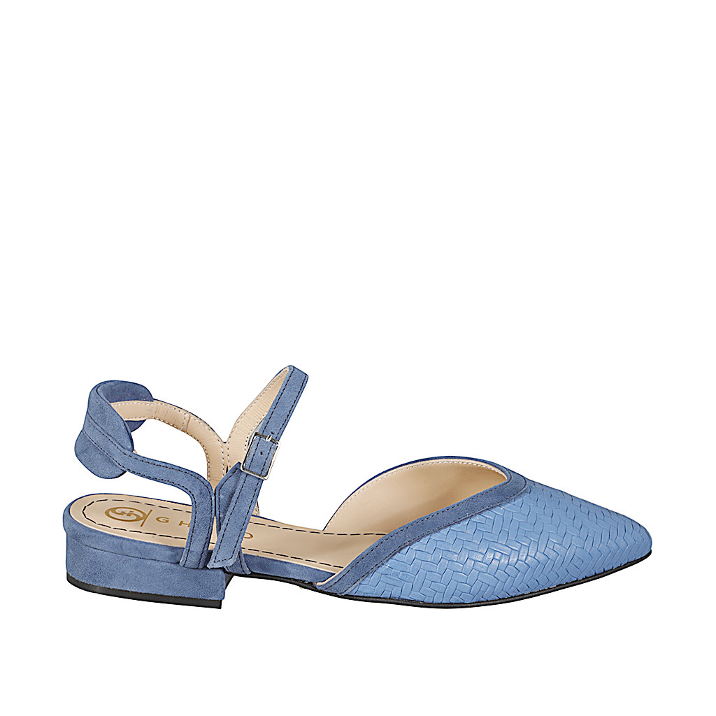 Woman's pointed slingback in braided blue leather with edges in blue suede and heel 2