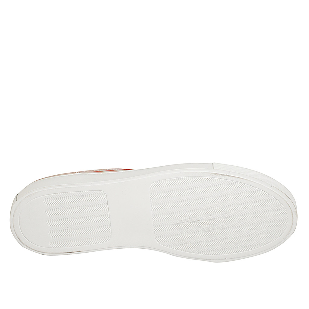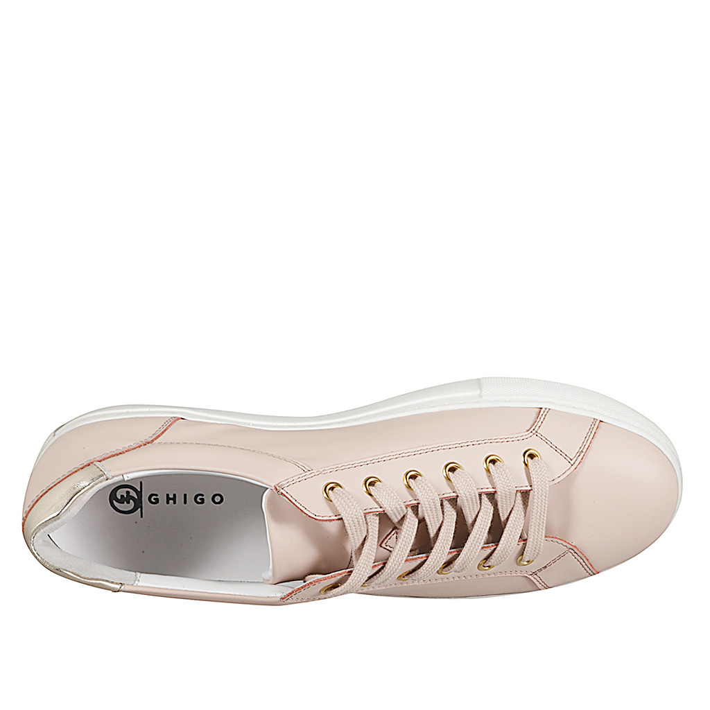 Woman's lace-up sneaker with removable insole in pink and platinum laminated leather wedge 3