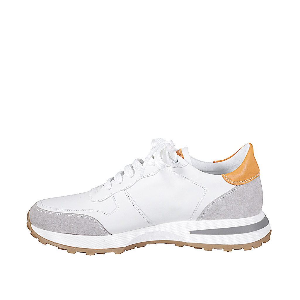 Woman's sneaker shoe with removable insole in white and orange leather and grey suede wedge heel 4
