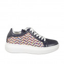 Woman's laced shoe with removable insole in dark blue leather and multicolor braided raffia fabric wedge heel 4