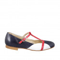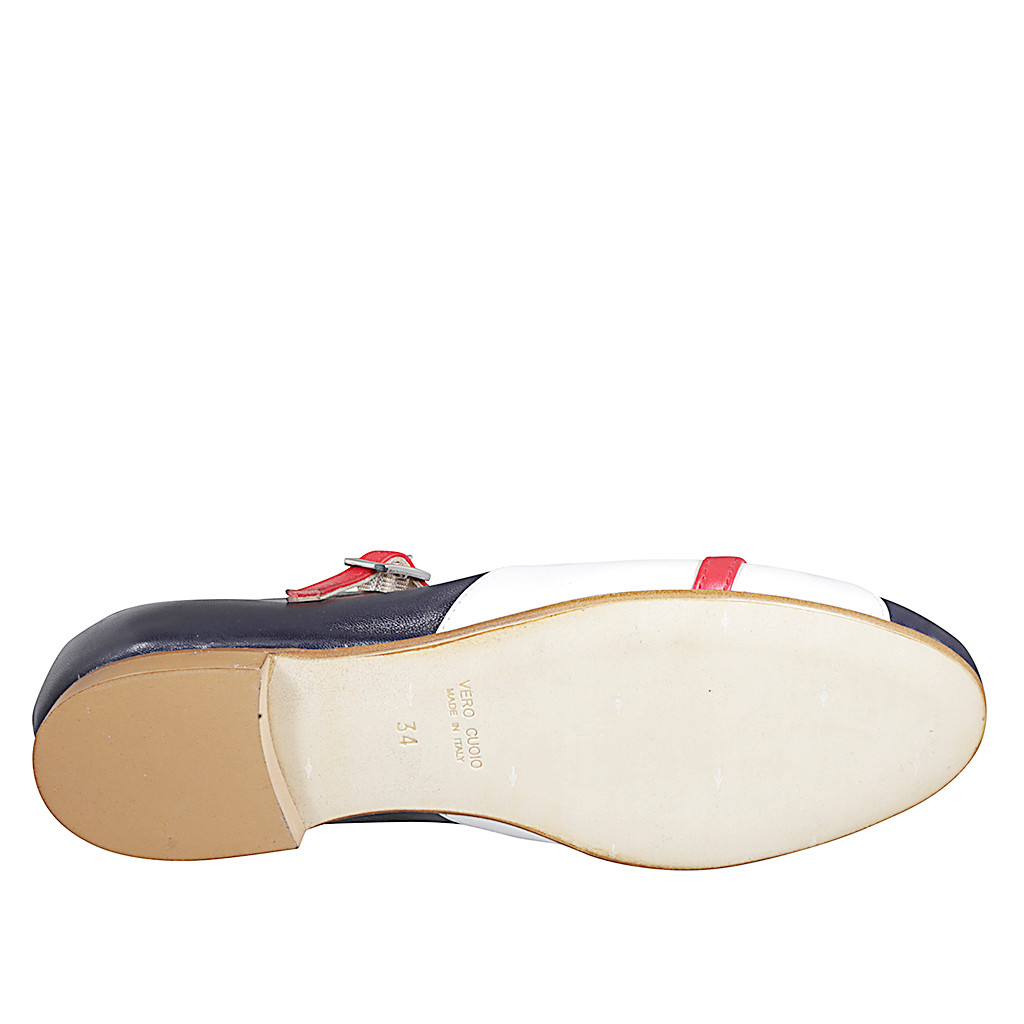 Woman's ballerina with T-strap in blue, white and red leather heel 1